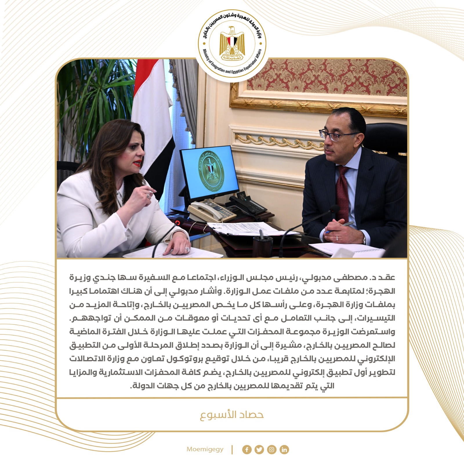 عقد الدكتور مصطفى مدبولي، رئيس مجلس الوزراء، اجتماعا مع السفيرة سها جندي وزيرة الهجرة؛ لمتابعة عدد من ملفات عمل الوزارة. وأشار مدبولي إلى أن هناك اهتماما كبيرا بملفات وزارة الهجرة، وعلى رأسها كل ما يخص المصريين بالخارج، وإتاحة المزيد من التيسيرات، إلى جانب التعامل مع أى تحديات أو معوقات من الممكن أن تواجههم. واستعرضت الوزيرة مجموعة المحفزات التي عملت عليها الوزارة خلال الفترة الماضية لصالح المصريين بالخارج، مشيرة إلى أن الوزارة بصدد إطلاق المرحلة الأولى من التطبيق الإلكتروني للمصريين بالخارج قريبا، من خلال توقيع بروتوكول تعاون مع وزارة الاتصالات لتطوير أول تطبيق إلكتروني للمصريين بالخارج، يضم كافة المحفزات الاستثمارية والمزايا التي يتم تقديمها للمصريين بالخارج من كل جهات الدولة.
