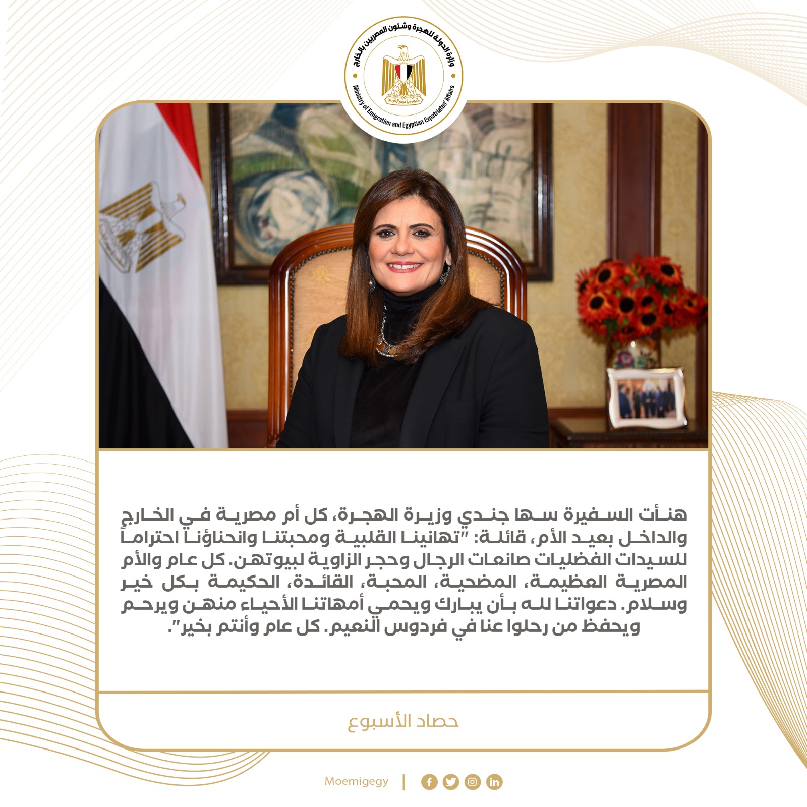 6- هنأت السفيرة سها جندي وزيرة الهجرة، كل أم مصرية في الخارج والداخل بعيد الأم، قائلة: "تهانينا القلبية ومحبتنا وانحناؤنا احتراماً للسيدات الفضليات صانعات الرجال وحجر الزاوية لبيوتهن. كل عام والأم المصرية العظيمة، المضحية، المحبة، القائدة، الحكيمة بكل خير وسلام. دعواتنا لله بأن يبارك ويحمي أمهاتنا الأحياء منهن ويرحم ويحفظ من رحلوا عنا في فردوس النعيم. كل عام وأنتم بخير".