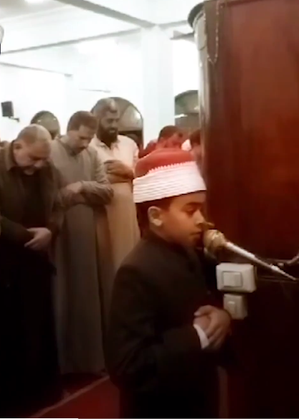 فقد أطل الطفل محمد القلاجي، مرتدياً زيا أزهرياً، ليتلو القرآن بصوت جميل ويؤم المصليين بأحد المساجد في البلاد.