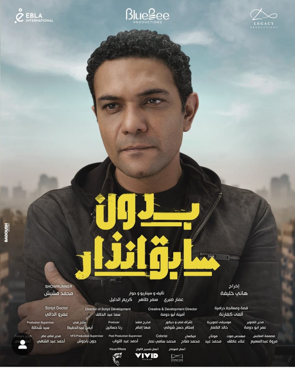 بدون سابق إنذار الفنان آسر ياسين والفنانة عائشة بن احمد ، أحمد خالد صالح، جهاد حسام، أحمد علي ماهر، و الفنانة نهال عنبروالمسلسل من تأليف ألمى كفارنة، وإنتاج شركة blue bee بالتعاون مع الشركة المتحدة للخدمان الإعلامية .