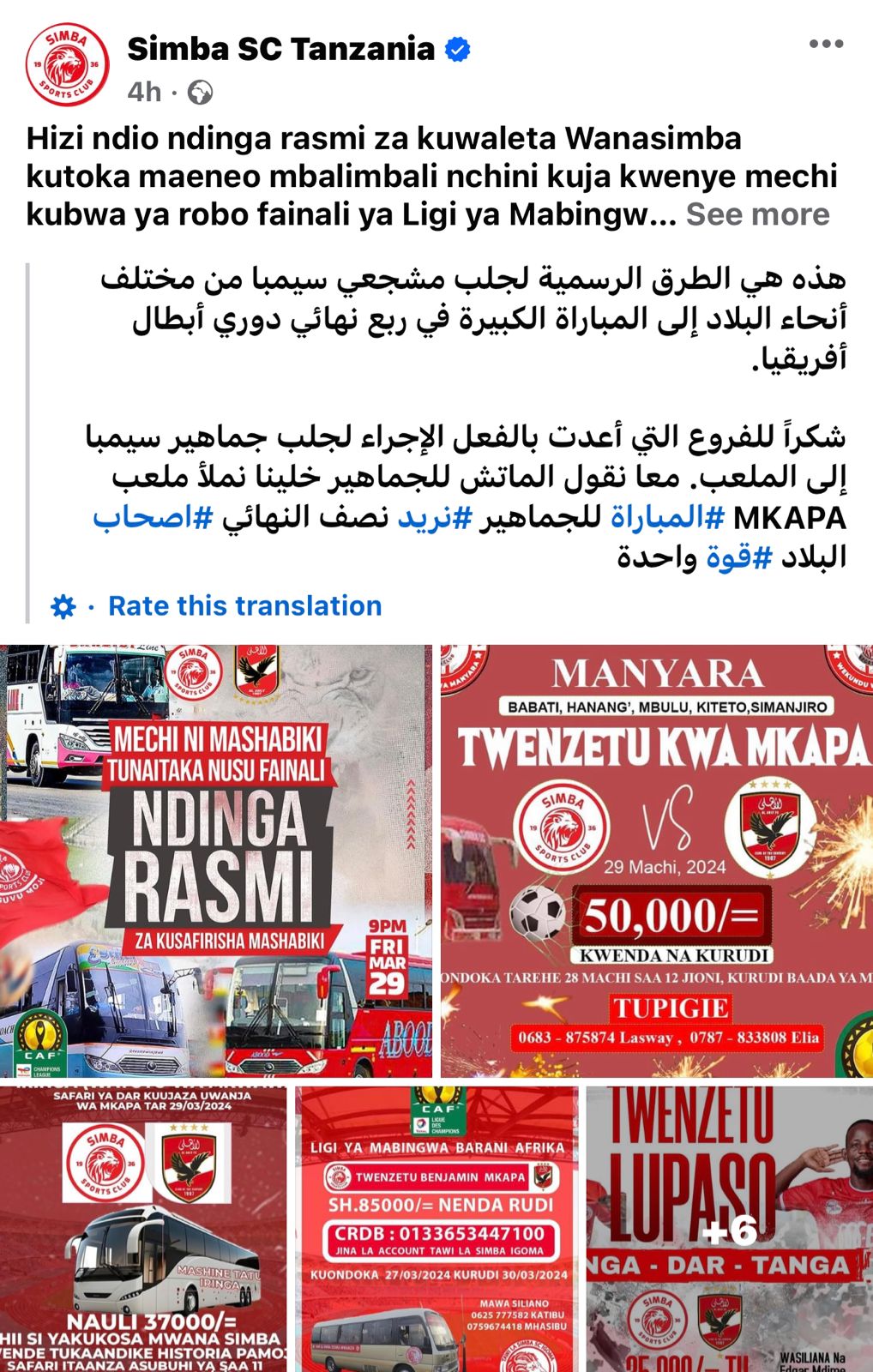 ونشرت الصفحة الرسمية لنادى سيمبا : هذه هي المنصات الرسمية لجلب نانا سيمبا من مختلف أنحاء البلاد إلى مباراة ربع النهائي الكبرى لدوري أبطال إفريقيا".