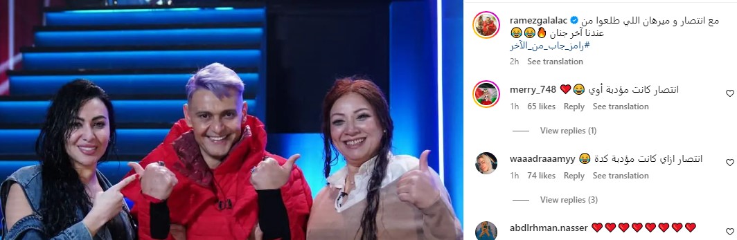ونشر رامز جلال، صورة عبر حسابه الرسمي بموقع تبادل الصور والفيديوهات "إنستجرام"، وعلق: "مع انتصار وميرهان اللي طلعوا من عندنا اخر جنان".
