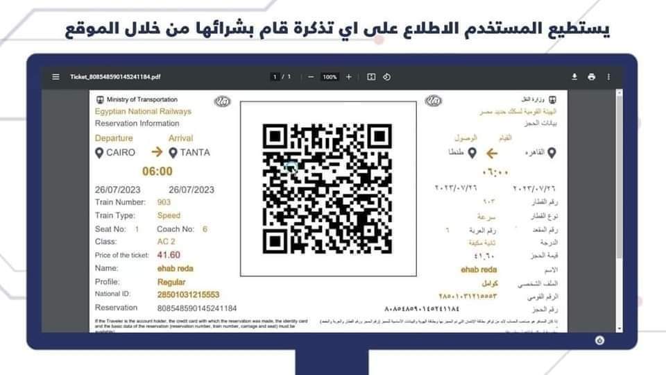 أعلنت وزارة النقل إنه فى إطار سياسة التحديث والتطوير التى تقوم بها الوزارة متمثلة فى الهيئة القومية لسكك حديد مصر بمختلف قطاعاتها وتنفيذاً لتوجيهات الفريق مهندس كامل الوزير ، وزير النقل بالإرتقاء بمستوى الخدمة المقدمة لجمهور الركاب تعلن الهيئة عن إتاحة الحصول على تذاكر السفر على جميع القطارات من خلال عدد من الطرق المختلفة وذلك تيسيراً على جمهور الركاب ولمواجهة التكدس أمام شبابيك التذاكر