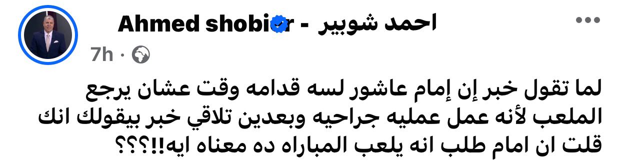 ونشر شوبير رسالة على حسابه الشخصي على موقع التواصل الاجتماعي "فيس بوك" يعبر فيها عن استيائه، قائلًا: "كيف يتم تشويه تصريحاتي بشأن عودة إمام عاشور للملعب بعد إجرائه عملية جراحية؟ وبالتزامن يروجون لأنني ذكرت أن إمام طلب المشاركة في المباراة!؟".