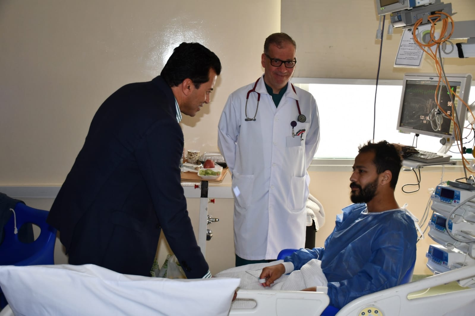 وزير الرياضة يتحدث مع اللاعب احمد رفعت خلال زيارته بمستشفى وادى النيل للاطمئنان على حالته الصحية