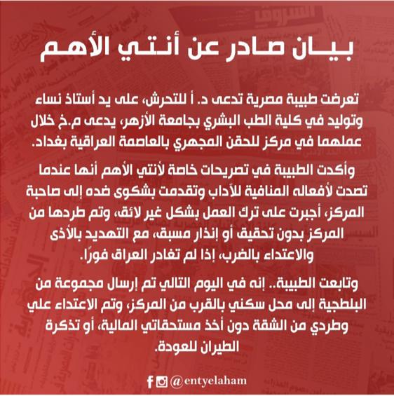 «أنتي الأهم» تعلن تضامنها مع طبيبة مصرية تعرضت للتحرش في العراق