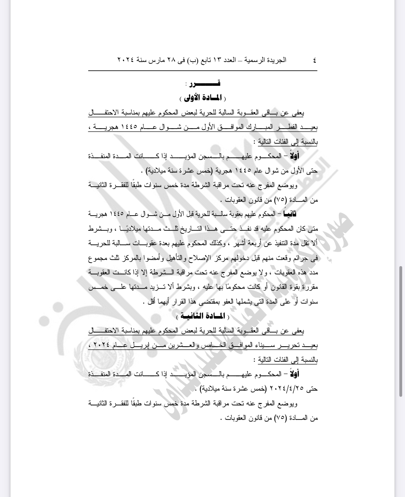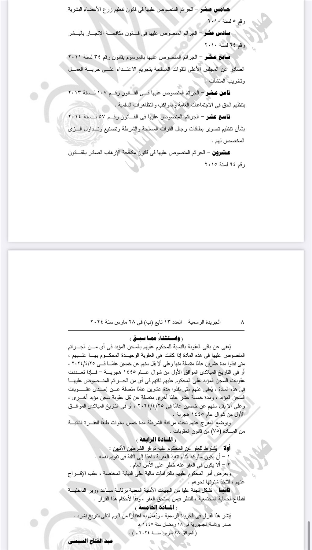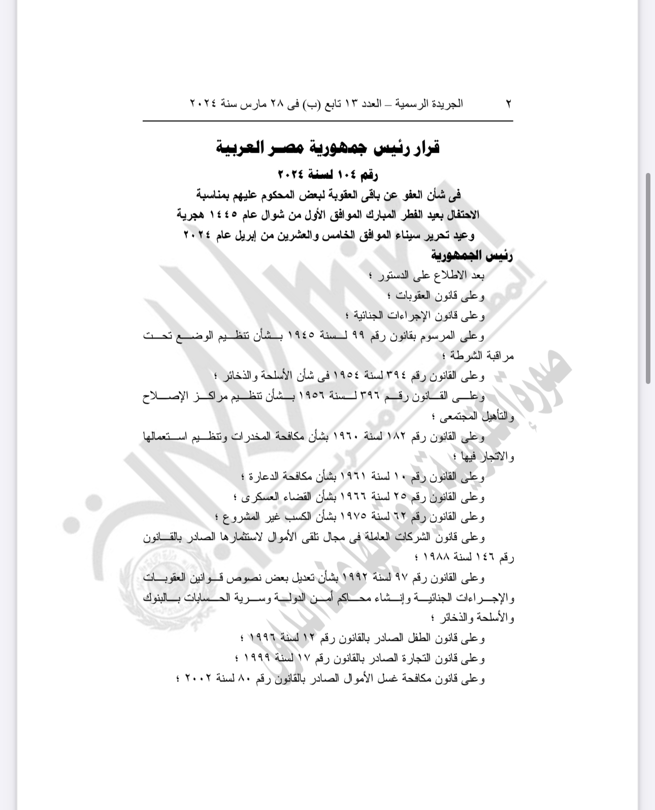 أصدر الرئيس عبد الفتاح السيسى القرار رقم 104 لسنة 2024 فى شأن باقي العقوبة لبعض المحكوم عليهم بمناسبة الاحتفال بعيد الفطر المبارك الموافق الأول من شوال عام 1445هجرية وعيد تحرير سيناء الموافق الخامس والعشرين من أبريل عام 2024.