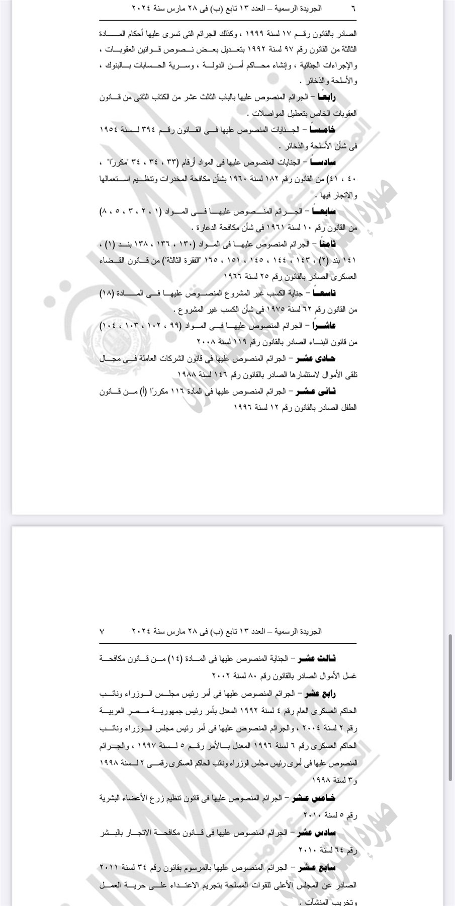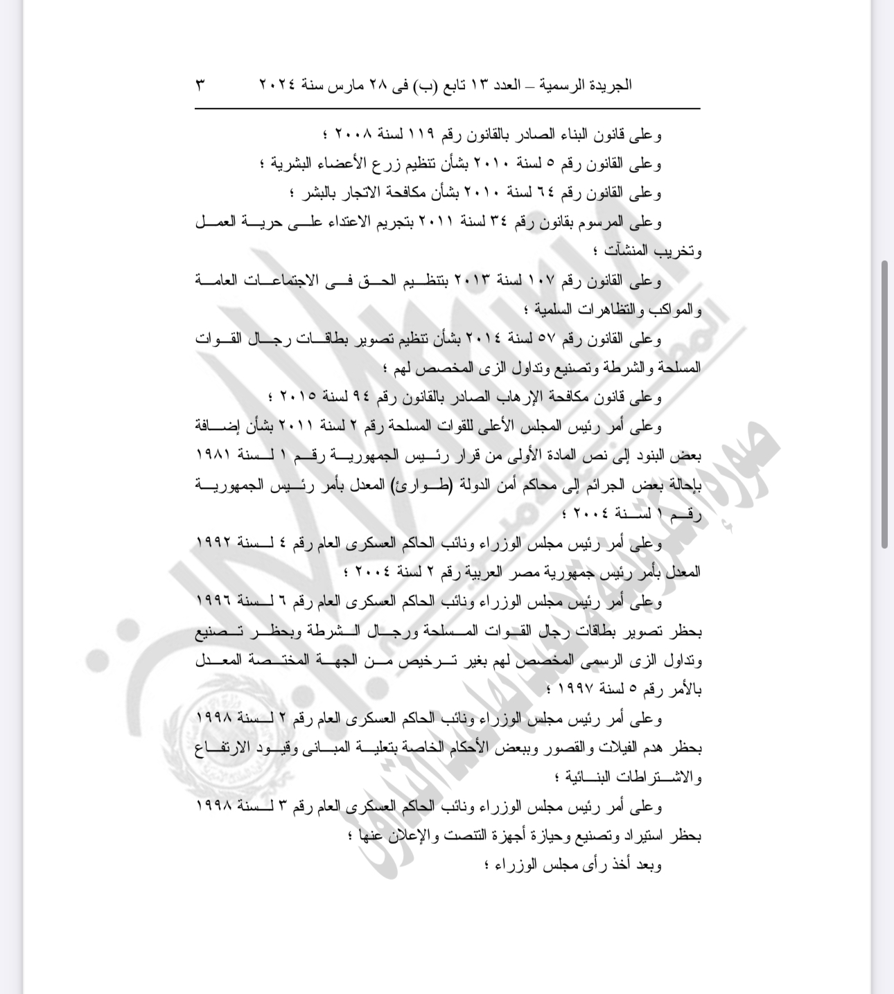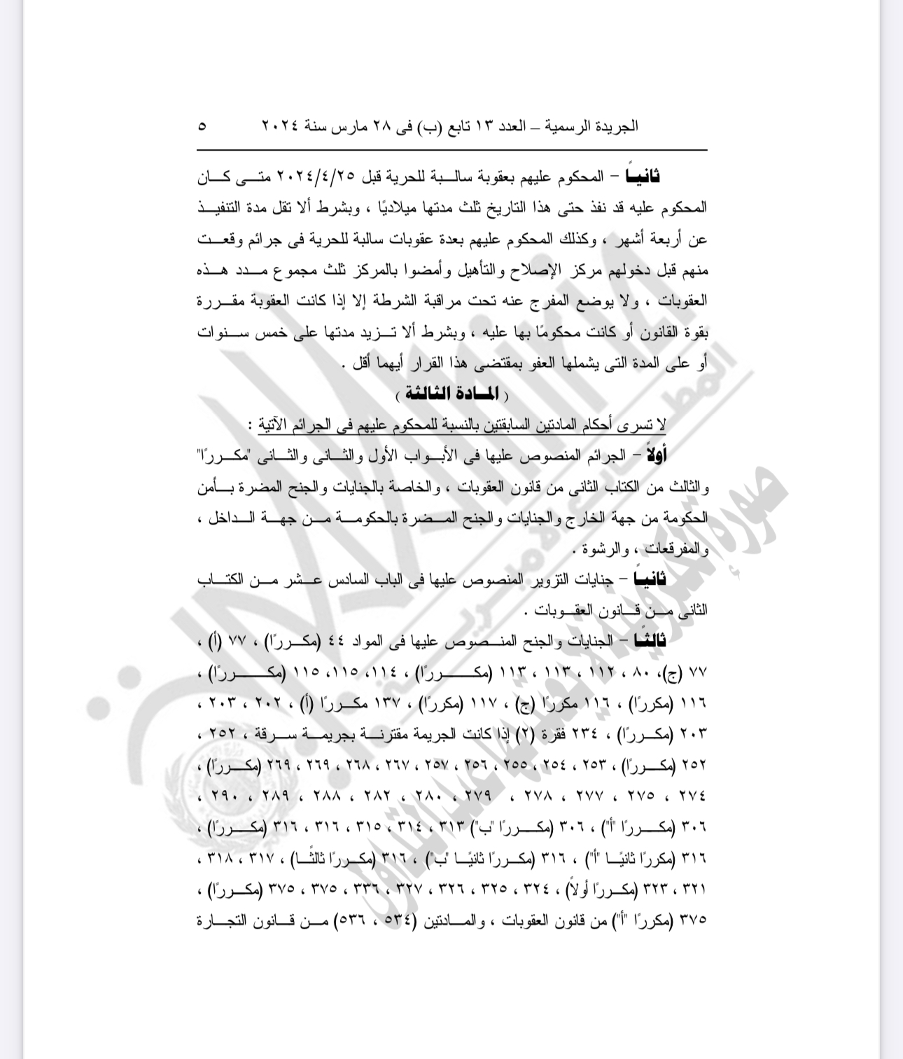أصدر الرئيس عبد الفتاح السيسى القرار رقم 104 لسنة 2024 فى شأن باقي العقوبة لبعض المحكوم عليهم بمناسبة الاحتفال بعيد الفطر المبارك الموافق الأول من شوال عام 1445هجرية وعيد تحرير سيناء الموافق الخامس والعشرين من أبريل عام 2024.