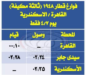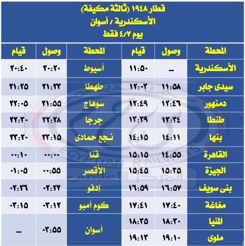 - تشغيل قطار 1948 ( ثالثة مكيفة ) الإسكندرية / أسوان يوم 7 / 4 / 2024 فقط حيث يقوم من محطة الاسكندرية الساعة 11:50 ويصل أسوان الساعة 03:55 طبقا للجدول المرفق على أن يتم تشغيل فوارغ القطار يوم 7 / 4 / 2024 فقط بين القاهرة / الاسكندرية حيث يقوم من القاهرة الساعة 00:10 ويصل الاسكندرية الساعة 02:35 طبقاً للجدول المرفق .
