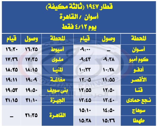- تشغيل قطار 1947 ( ثالثة مكيفة ) أسوان / القاهرة يوم 12/4/2024 فقط حيث يقوم من محطة أسوان الساعة 09:00 ويصل القاهرة الساعة 21:35 طبقا للجدول المرفق .