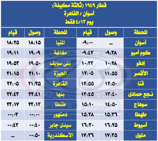 - تشغيل قطار 1949 ثالثة مكيفة أسوان / الاسكندرية يوم 13/ 4/ 2024 فقط محطة أسوان الساعة 09:00 ويصل الاسكندرية الساعة 00:50 طبقا للجدول المرفق على أن يتم تشغيل فوارغ القطار يوم 7 / 4 / 2024 فقط بين الإسكندرية / القاهرة حيث يقوم من الاإسكندرية الساعة 11:50 ويصل الاسكندرية الساعة 14:15 طبقاً للجدول المرفق .
