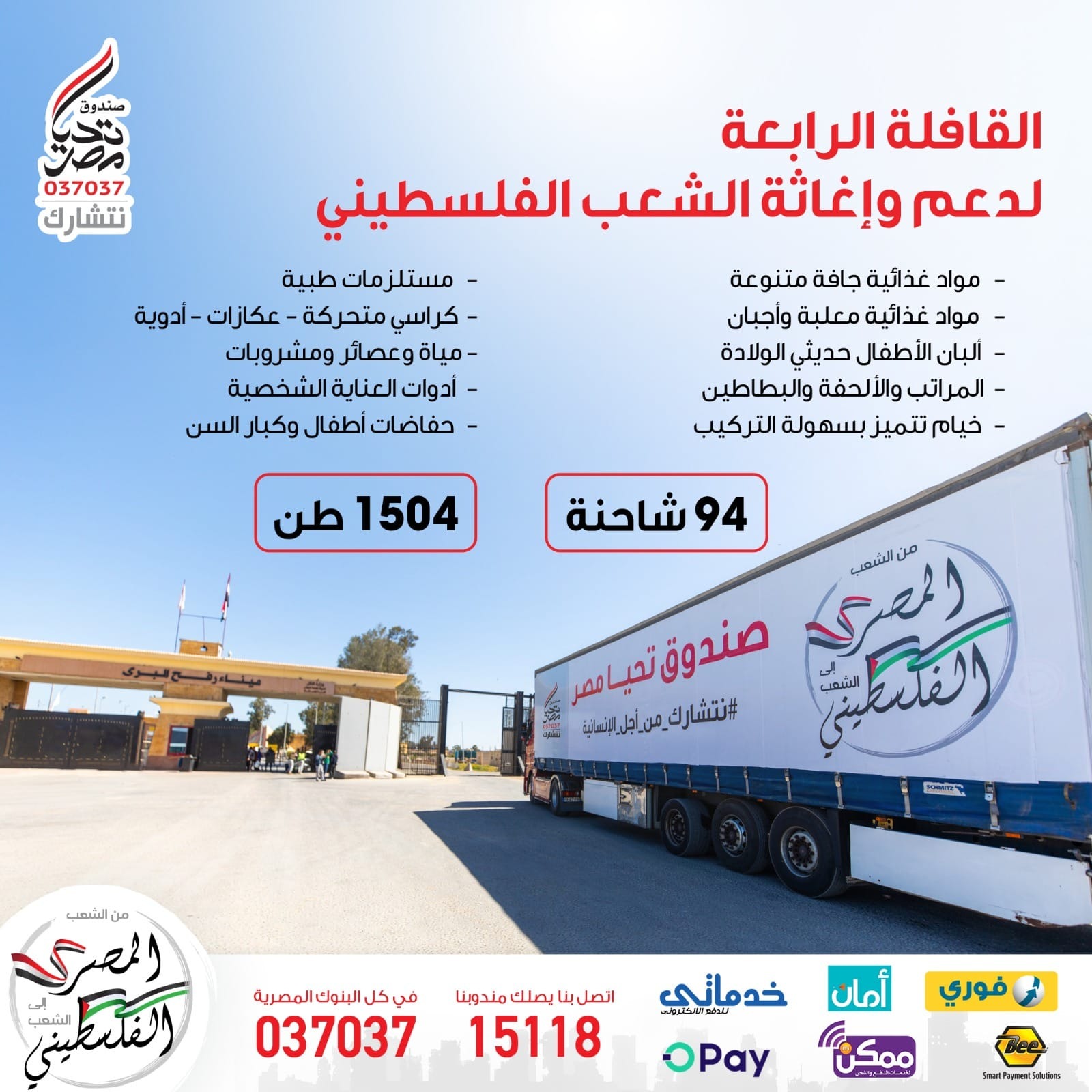 أطلق صندوق تحيا مصر ظهر يوم الإثنين القافلة الرابعة لإغاثة أهل غزة، محملة بكميات ضخمة من المساعدات الغذائية وكافة الاحتياجات الأساسية تحت شعار "نتشارك من أجل الإنسانية"في إطار دعم الأشقاء الفلسطينيين بقطاع غزة، وقبل حلول عيد الفطر المبارك، ويأتي ذلك تنفيذًا لتوجيهات الرئيس عبد الفتاح السيسي رئيس الجمهورية، إيمانًا بأهمية التضامن الإنساني في ظل الظروف العصيبة التي يمر بها الشعب الفلسطيني.