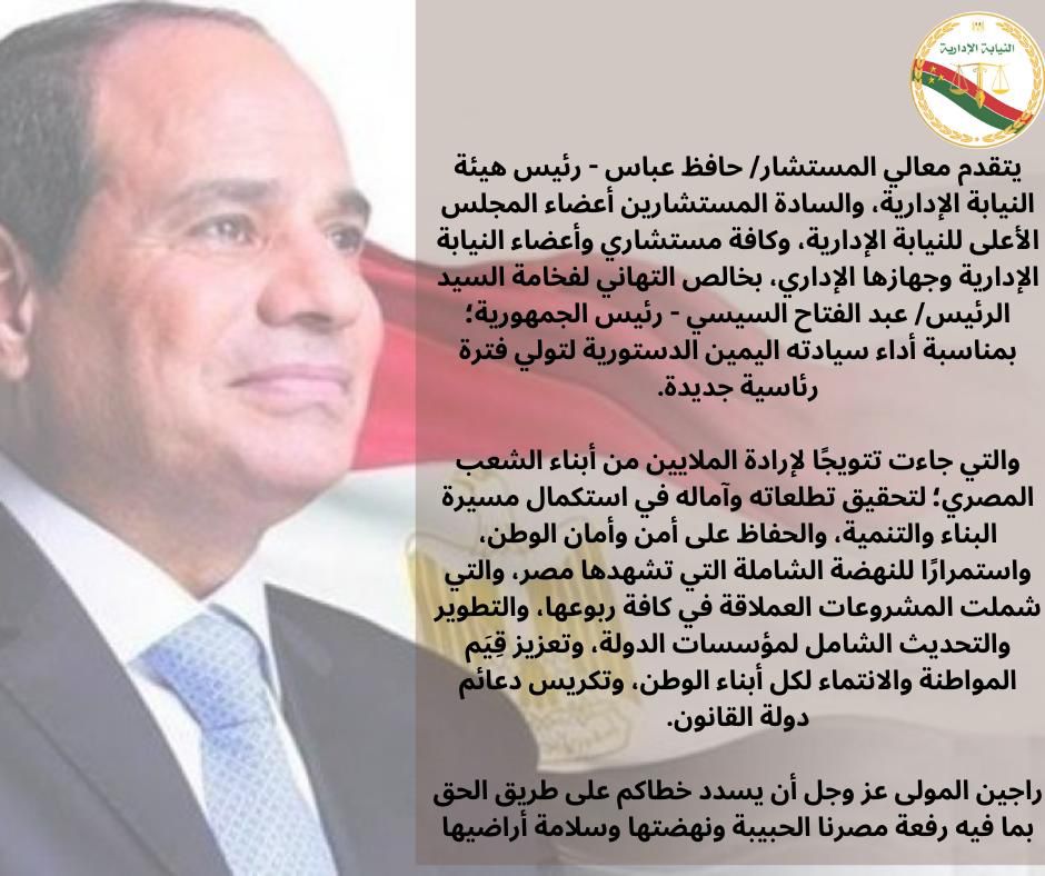 يتقدم المستشار حافظ عباس - رئيس هيئة النيابة الإدارية، والسادة المستشارين أعضاء المجلس الأعلى للنيابة الإدارية، وكافة مستشاري وأعضاء النيابة الإدارية وجهازها الإداري، بخالص التهاني للرئيس عبد الفتاح السيسي - رئيس الجمهورية؛بمناسبة أداء سيادته اليمين الدستورية لتولي فترة رئاسية جديدة.