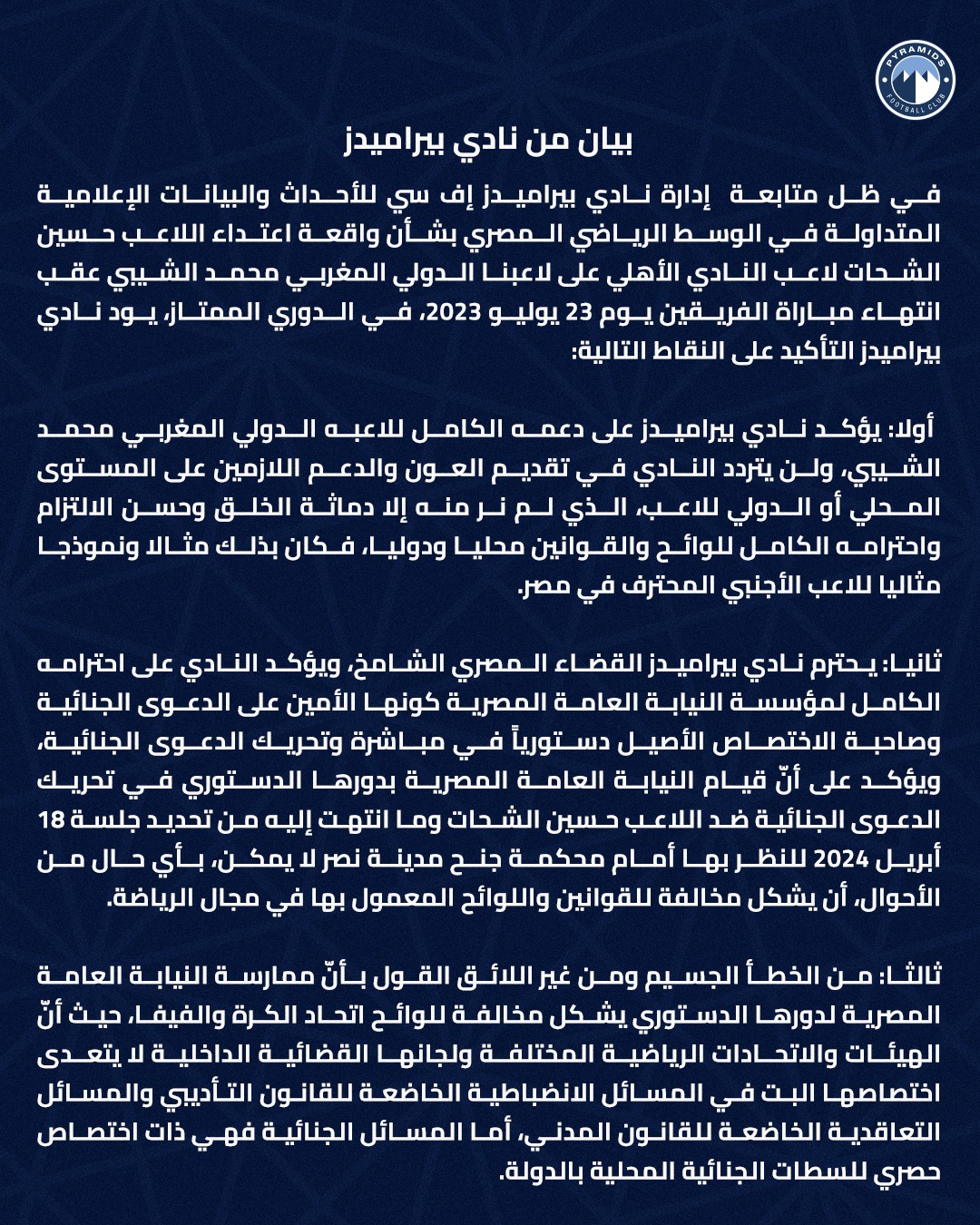 في ظل متابعة إدارة نادي بيراميدز إف سي للأحداث والبيانات الإعلامية المتداولة في الوسط الرياضي المصري بشأن واقعة اعتداء اللاعب حسين الشحات لاعب النادي الأهلي على لاعبنا الدولي المغربي محمد الشيبي عقب انتهاء مباراة الفريقين يوم 23 يوليو 2023، في الدوري الممتاز، يود نادي بيراميدز التأكيد على النقاط التالية: