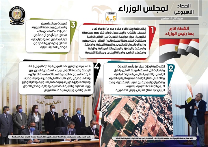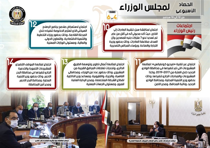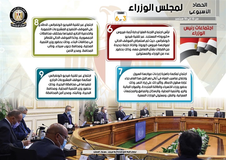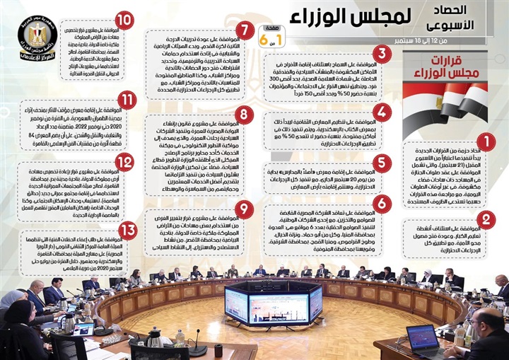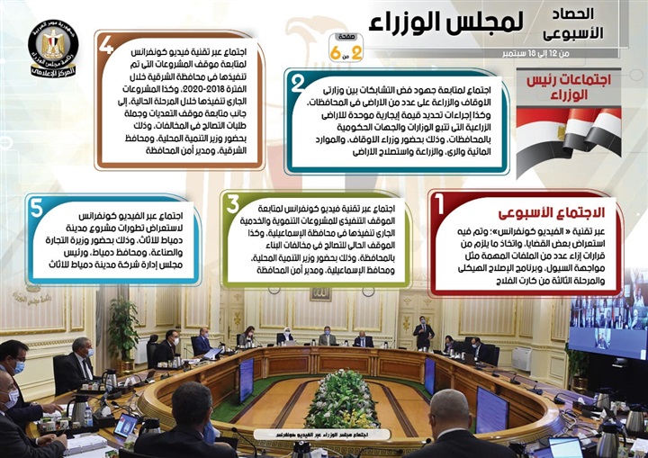 الحصاد الأسبوعي لمجلس الوزراء، وذلك خلال الفترة من 12 حتى 18 سبتمبر 2020، والذي