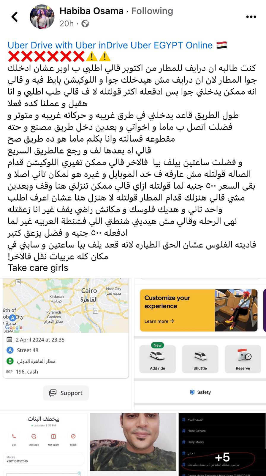 وتابعت ،" طول الطريق قاعد يدخلني في طرق غريبه و حركاته غريبه و متوتر و فضلت اتصل ب ماما و اخواتي و بعدين دخل طريق مصنع و حته مقطوعه فسالته وانا بكلم ماما هو ده طريق صح قالي اه بعدها لف و رجع عالطريق السريع .. فضلت ساعتين بيلف بيا فالاخر قالي ممكن تغيري اللوكيشن قدام الصاله قولتله مش عارفه ف خد الموبايل و غيره هو لمكان تاني اصلا و بقى السعر ٥٠٠ جنيه لما قولتله ازاي قالي ممكن تنزلني هنا وقف وبعدين مشي قالي هنزلك قدام المطار قولتله لا هنزل هنا عشان اعرف اطلب واحد تاني و هديك فلوسك و مكانش راضي يقف غير انا زعقتله نهى الرحله وقالي مش هيديني شنطتي اللي فشنطة العربيه غير لما ادفعله ٥٠٠ جنيه و فضل يزعق كتير فاديته الفلوس عشان الحق الطياره لانه قعد يلف بيا ساعتين و سابني في مكان كله عربيات نقل فالاخر! ".