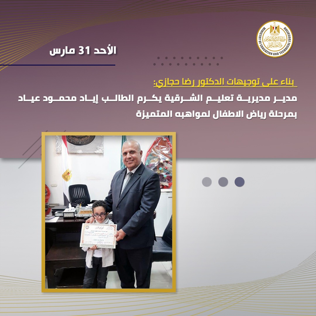 بناء على توجيهات الدكتور رضا حجازي وزير التربية والتعليم والتعليم الفني، استقبل على عبد الرؤوف مدير مديرية التربية والتعليم بالشرقية الطالب إياد محمود عياد بالصف الثانى بمرحلة رياض الأطفال "KG2” بمدرسة الكيلانية الرسمية لغات بإدارة بلبيس التعليمية بمحافظة الشرقية؛ حيث قام بتكريمه نظرا لمواهبه المتميزة والفريدة في مجال المعلومات العامة.