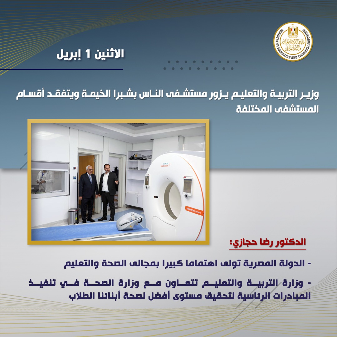 وأضاف الوزير أن وزارة التربية والتعليم تعمل على تنفيذ المبادرات الرئاسية بالتعاون مع وزارة الصحة؛ لتحقيق مستوى أفضل لصحة أبنائنا الطلاب.