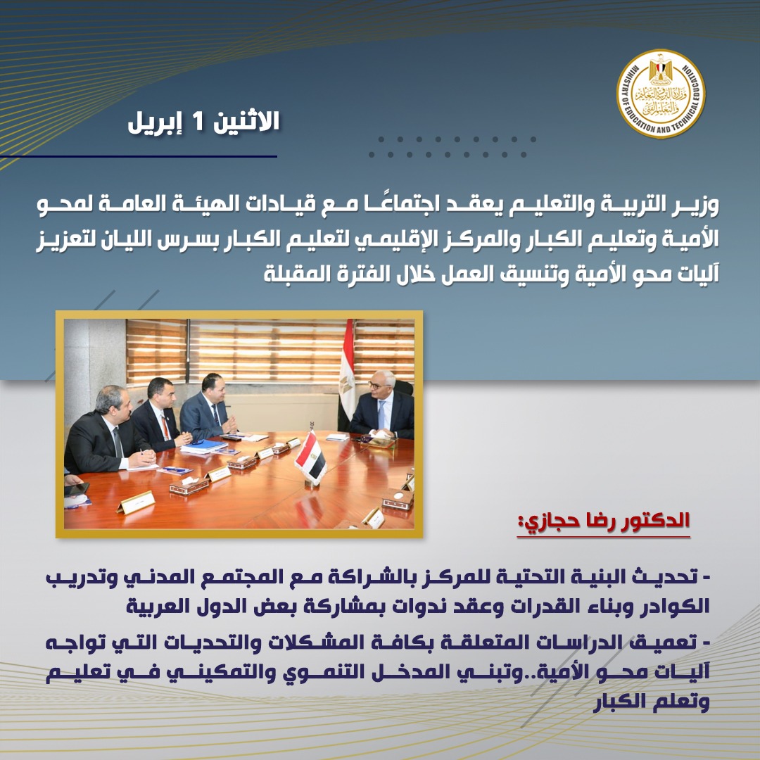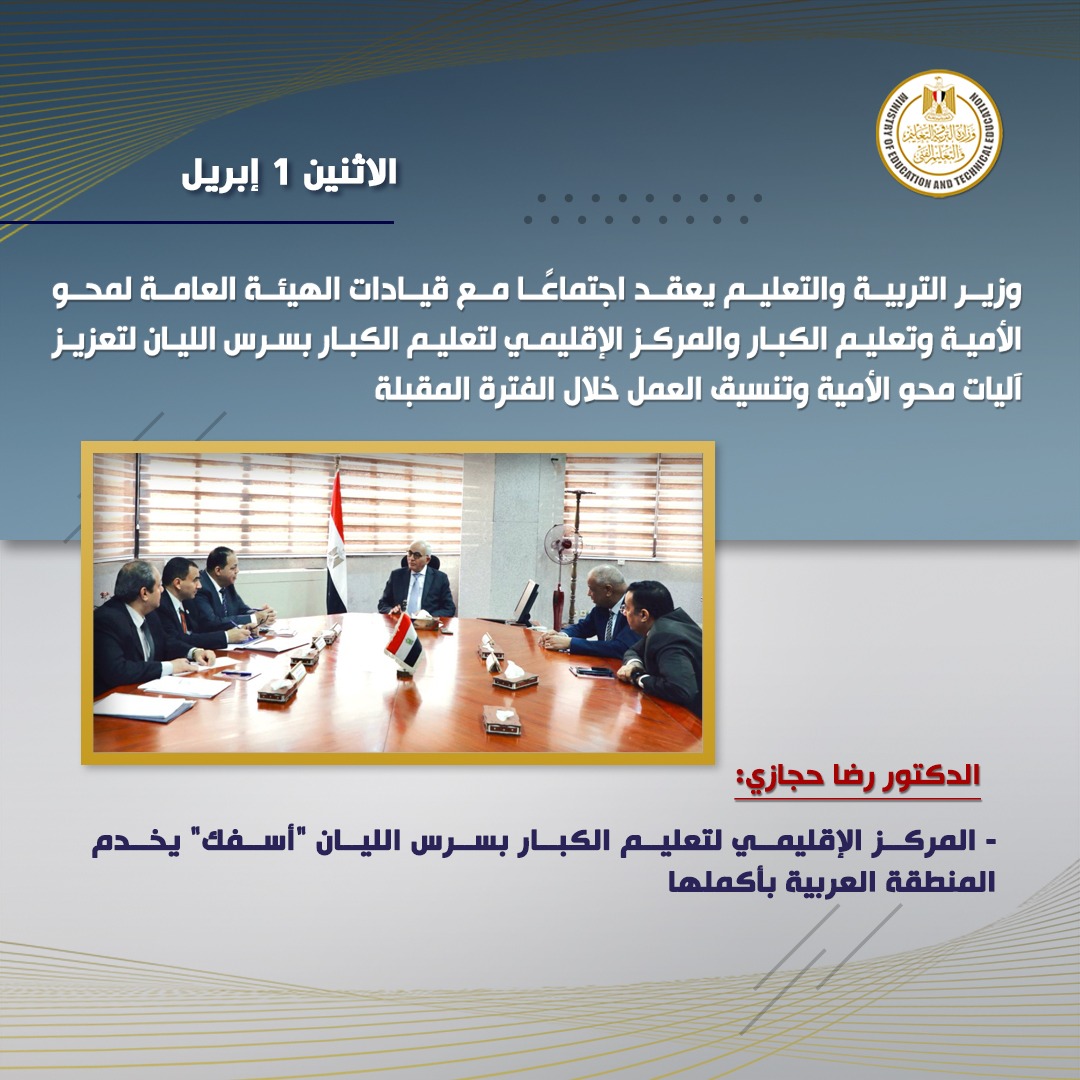 عقد الدكتور رضا حجازى وزير التربية والتعليم والتعليم الفني، اجتماعًا مع قيادات الهيئة العامة لمحو الأمية وتعليم الكبار والمركز الإقليمي لتعليم الكبار بسرس الليان، وذلك لبحث سبل تعزيز آليات محو الأمية وتنسيق العمل بين الجهتين والإدارة المركزية لمكافحة التسرب من التعليم وتعليم الكبار بالوزارة خلال الفترة المقبلة.