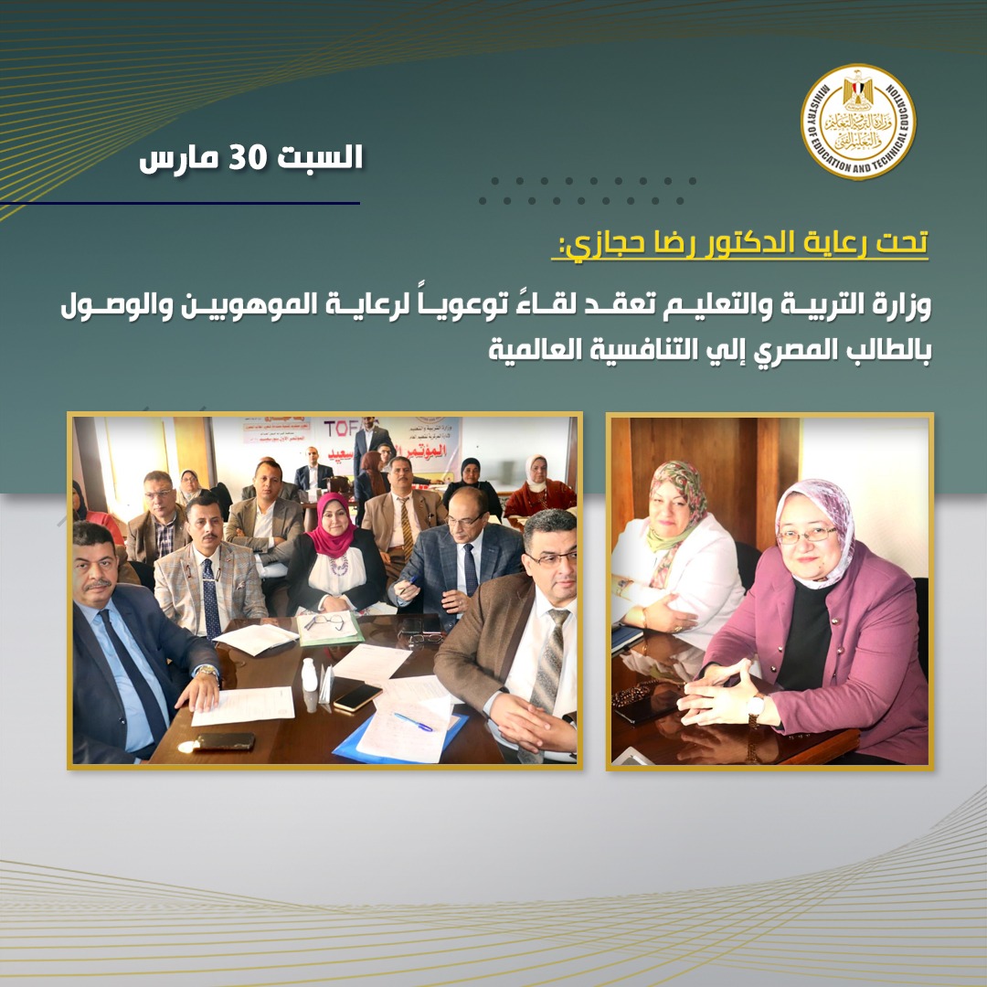 تحت رعاية الدكتور رضا حجازى وزير التربية والتعليم والتعليم الفنى، عقدت وزارة التربية والتعليم والتعليم الفنى لقاءً توعوياً لمديرى التعليم العام بجميع المديريات التعليمية بهدف رعاية الموهوبين والوصول بالطالب المصري إلي التنافسية العالمية، والتى نظمته الإدارة المركزية للتعليم العام على مدار يومي 28 و29 مارس الجارى بمحافظة بورسعيد.