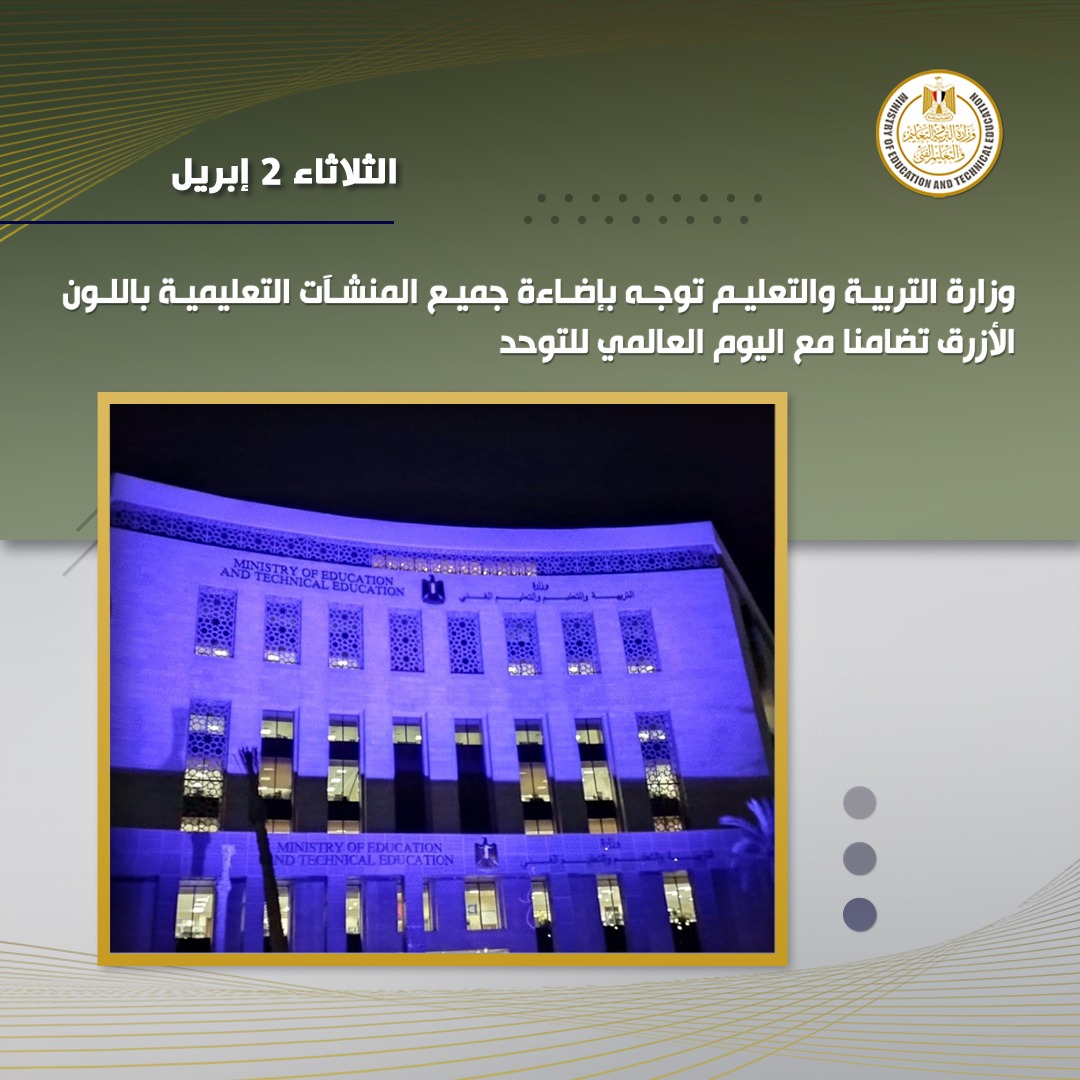 فى إطار حرص وزارة التربية والتعليم والتعليم الفنى على دعم ذوى الاحتياجات الخاصة، وتزامنًا مع اليوم العالمي لطيف التوحد الذي أعلنته الجمعية العامة للأمم المتحدة بقرار رقم 62 /139في 2 إبريل 2009 ، وجهت الوزارة بإضاءة جميع المنشآت التعليمية التابعة لها بداية من مبنى ديوان عام الوزارة بالعاصمة الإدارية الجديدة والمديريات والإدارات التعليمية والمدارس باللون الأزرق "شعار التوحد"؛ للتضامن والمشاركة في الحملة العالمية (Light It Up Blue) للتوعية باليوم العالمي للتوحد.