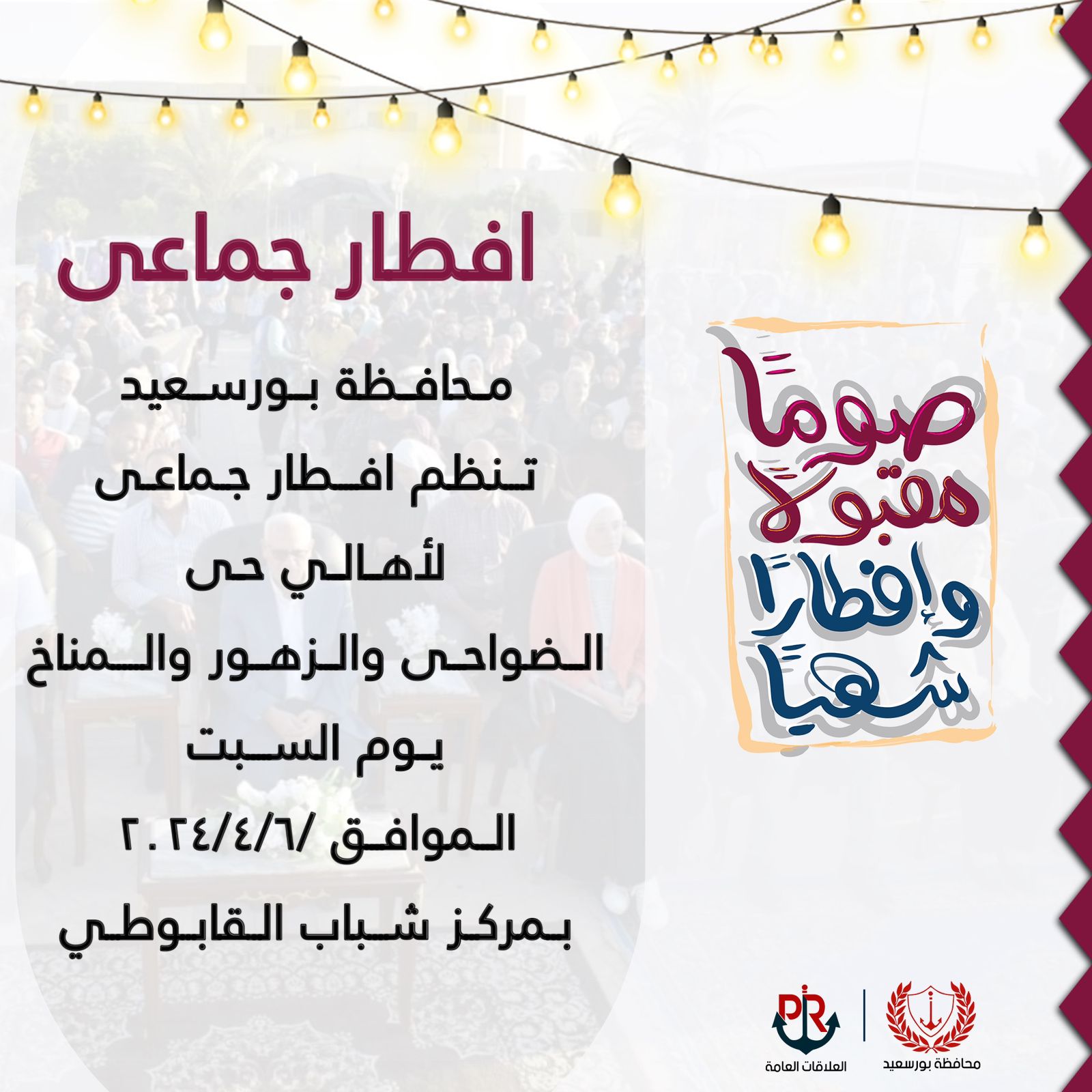 في إطار حرص اللواء عادل الغضبان محافظ بورسعيد ، على مشاركة كافة أطياف المجتمع البورسعيدي الإفطار الرمضاني ، تنظم محافظة بورسعيد إفطار جماعي لأهالي الزهور والضواحي و المناخ ، وذلك بمركز شباب القابوطي ، غدا السبت الموافق 6 أبريل الجاري ، بهدف تعزيز العلاقات الاجتماعية بين جميع أطياف المجتمع البورسعيدي ، وخلق أجواء أسرية تعكس الترابط و المحبة بين جميع أبناء المحافظة