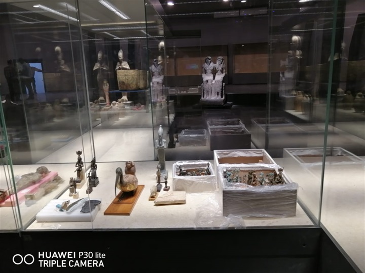 الآن أعضاء لجنة سيناريو العرض المتحفي بوضع القطع الأثرية بفتارين العرض الموجودة