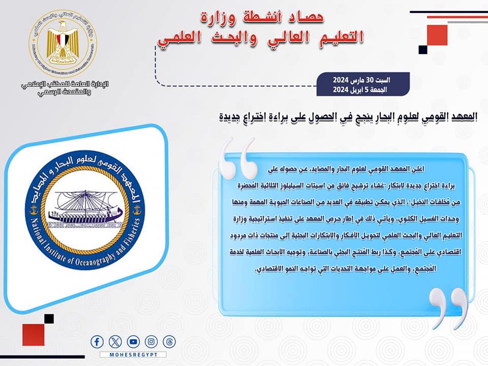 10) أعلن المعهد القومي لعلوم البحار والمصايد، عن حصوله على براءة اختراع جديدة لابتكار "غشاء ترشيح فائق من اسيتات السيليلوز الثلاثية المُحضرة من مُخلفات النخيل"، الذي يمكن تطبيقه في العديد من الصناعات الحيوية المهمة ومنها وحدات الغسيل الكلوي، ويأتي ذلك في إطار حرص المعهد على تنفيذ استراتيجية وزارة التعليم العالي والبحث العلمي لتحويل الأفكار والابتكارات البحثية إلى منتجات ذات مردود اقتصادي على المُجتمع، وكذا ربط المُنتج البحثي بالصناعة، وتوجيه الأبحاث العلمية لخدمة المُجتمع، والعمل على مواجهة التحديات التي تواجه النمو الاقتصادي.