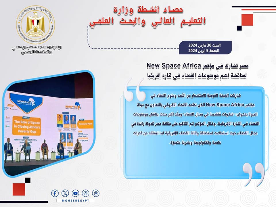 7) شاركت الهيئة القومية للاستشعار من البُعد وعلوم الفضاء في مؤتمر New Space Africa الذي نظمه الاتحاد الإفريقي بالتعاون مع دولة أنجولا بعنوان: "خطوات مُتقدمة في مجال الفضاء" ويعُد أكبر حدث يناقش موضوعات الفضاء في القارة الإفريقية، وخلال المؤتمر تم التأكيد على مكانة مصر كدولة رائدة في مجال الفضاء، حيث استطاعت استضافة وكالة الفضاء الإفريقية لما تمتلكه من قدرات علمية وتكنولوجية وبشرية متميزة.