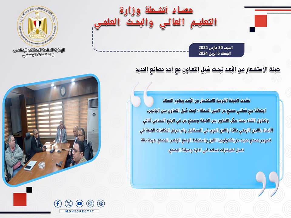 9) عقدت الهيئة القومية للاستشعار من البُعد وعلوم الفضاء اجتماعًا مع مُمثلي مصنع عز "العين السخنة"؛ لبحث سُبل التعاون بين الجانبين، وتناول اللقاء بحث سبُل التعاون بين الهيئة ومصنع عز، في الرفع المساحي ثلاثي الأبعاد بالليزر الأرضي حاليًا والليزر الجوي في المستقبل وتم عرض امكانيات الهيئة في تصوير مصنع حديد عز بتكنولوجيا الليزر واستنباط الوضع الراهن للمصنع بدرجة دقة تصل لمليمترات تساعد في ادارة وصيانة المصنع.