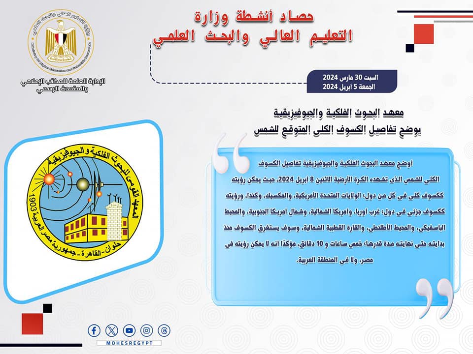 6) أوضح معهد البحوث الفلكية والجيوفيزيقية تفاصيل الكسوف الكلى للشمس الذى تشهده الكرة الأرضية الاثنين 8 أبريل 2024، حيث يمكن رؤيته ككسوف كلى فى كل من دول؛ الولايات المتحدة الأمريكية، والمكسيك، وكندا، ورؤيته ككسوف جزئى فى دول؛ غرب أوربا، وأمريكا الشمالية، وشمال أمريكا الجنوبية، والمحيط الباسفيكى، والمحيط الأطلنطى، والقارة القطبية الشمالية، وسوف يستغرق الكسوف منذ بدايته حتى نهايته مدة قدرها؛ خمس ساعات و 10 دقائق، مؤكدًا أنه لا يمكن رؤيته فى مصر، ولا فى المنطقة العربية.