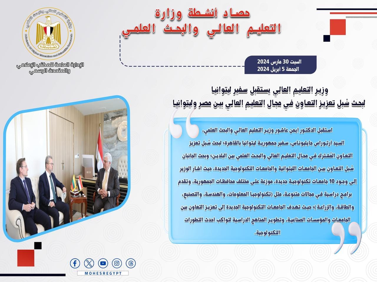 4) استقبل الدكتور أيمن عاشور وزير التعليم العالي والبحث العلمي، السيد أرتوراس جايليوناس، سفير جمهورية ليتوانيا بالقاهرة؛ لبحث سُبل تعزيز التعاون المُشترك في مجال التعليم العالي والبحث العلمي بين البلدين؛ وبحث الجانبان سُبل التعاون بين الجامعات الليتوانية والجامعات التكنولوجية الجديدة، حيث أشار الوزير إلى وجود 10 جامعات تكنولوجية جديدة، موزعة على مختلف محافظات الجمهورية، وتقدم برامج دراسية في مجالات متنوعة، مثل (تكنولوجيا المعلومات، والهندسة، والتصنيع، والطاقة، والزراعة)؛ حيث تهدف الجامعات التكنولوجية الجديدة إلى تعزيز التعاون بين الجامعات والمؤسسات الصناعية، وتطوير المناهج الدراسية لتواكب أحدث التطورات التكنولوجية.