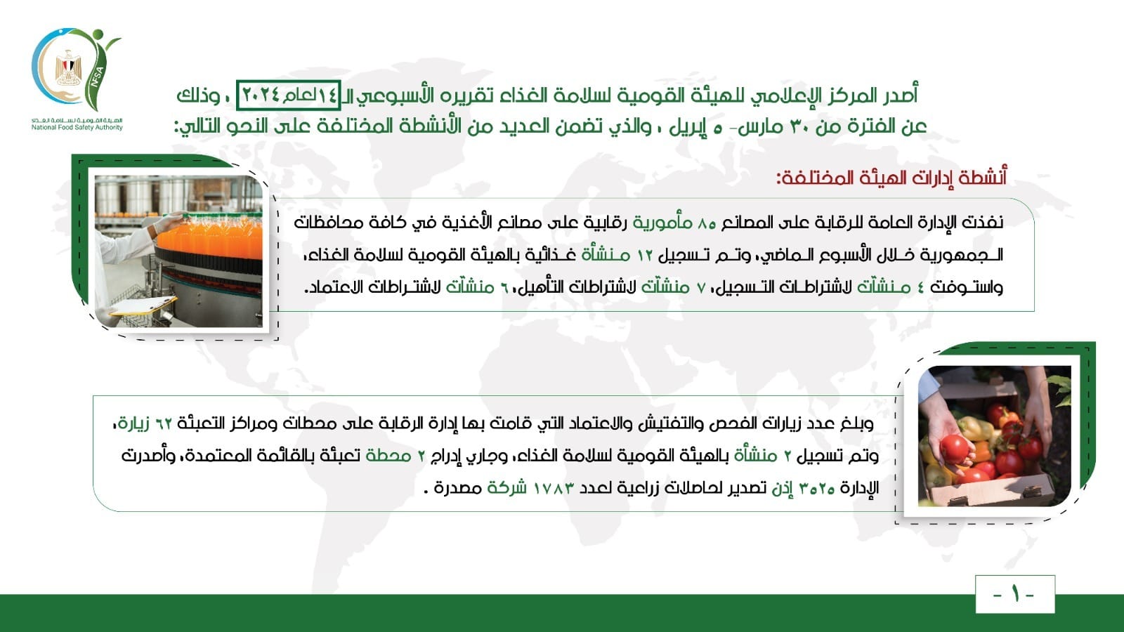 بالإنفوجراف.. المركز الإعلامي للهيئة القومية لسلامة الغذاء يصدر تقريره الأسبوعي الــ 14 لعام 2024