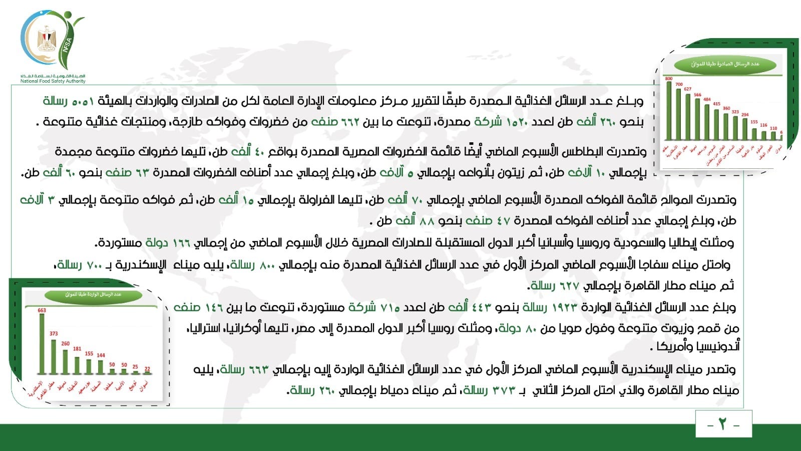واحتل ميناء سفاجا الأسبوع الماضي المركز الأول في عدد الرسائل الغذائية المصدرة منه بإجمالي 800 رسالة، يليه ميناء الإسكندرية بـ 700 رسالة، ثم ميناء مطار القاهرة بإجمالي 627 رسالة.