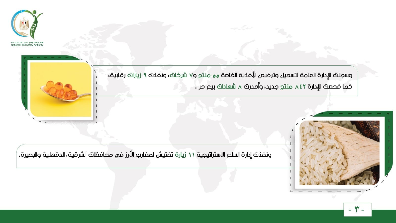 وسجلت الإدارة العامة لتسجيل وترخيص الأغذية الخاصة 55 منتج و7 شركات، ونفذت 9 زيارات رقابية، كما فحصت الإدارة 842 منتج جديد، وأصدرت 8 شهادات بيع حر.