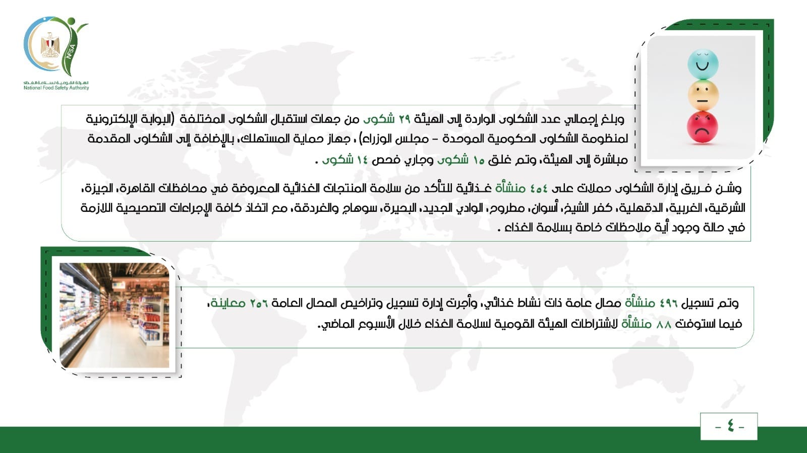وشن فريق إدارة الشكاوى حملات على 454 منشأة غذائية للتأكد من سلامة المنتجات الغذائية المعروضة في محافظات القاهرة، الجيزة، الشرقية، الغربية، الدقهلية، كفر الشيخ، أسوان، مطروح، الوادي الجديد، البحيرة، سوهاج والغردقة، مع اتخاذ كافة الإجراءات التصحيحية اللازمة في حالة وجود أية ملاحظات خاصة بسلامة الغذاء.