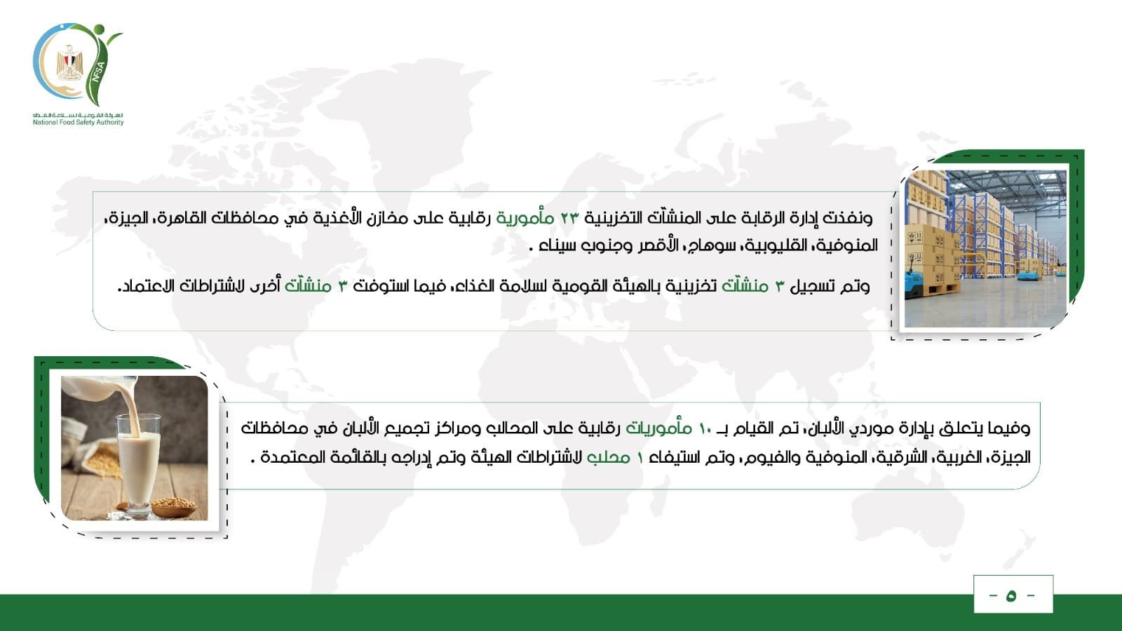 وفيما يتعلق بإدارة موردي الألبان، تم القيام بــ 10 مأموريات رقابية على المحالب ومراكز تجميع الألبان في محافظات الجيزة، الغربية، الشرقية، المنوفية والفيوم، وتم استيفاء 1 محلب لاشتراطات الهيئة وتم إدراجه بالقائمة المعتمدة.