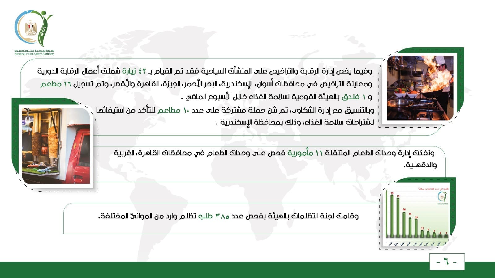 وفيما يخص إدارة الرقابة والتراخيص على المنشآت السياحية فقد تم القيام بـ 42 زيارة شملت أعمال الرقابة الدورية ومعاينة التراخيص في محافظات أسوان، الإسكندرية، البحر الأحمر، الجيزة، القاهرة والأقصر، وتم تسجيل 16 مطعم و 1 فندق بالهيئة القومية لسلامة الغذاء خلال الأسبوع الماضي.