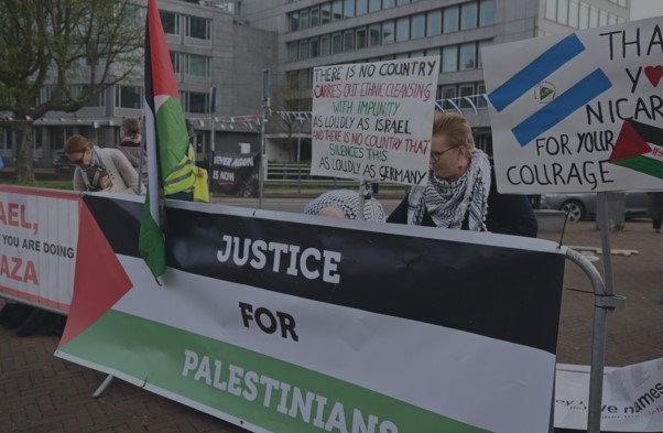 تزامنا مع قضية نيكاراغوا ضد ألمانيا ..مظاهرة أمام “العدل الدولية” في لاهاي لنصرة فلسطين (صور)