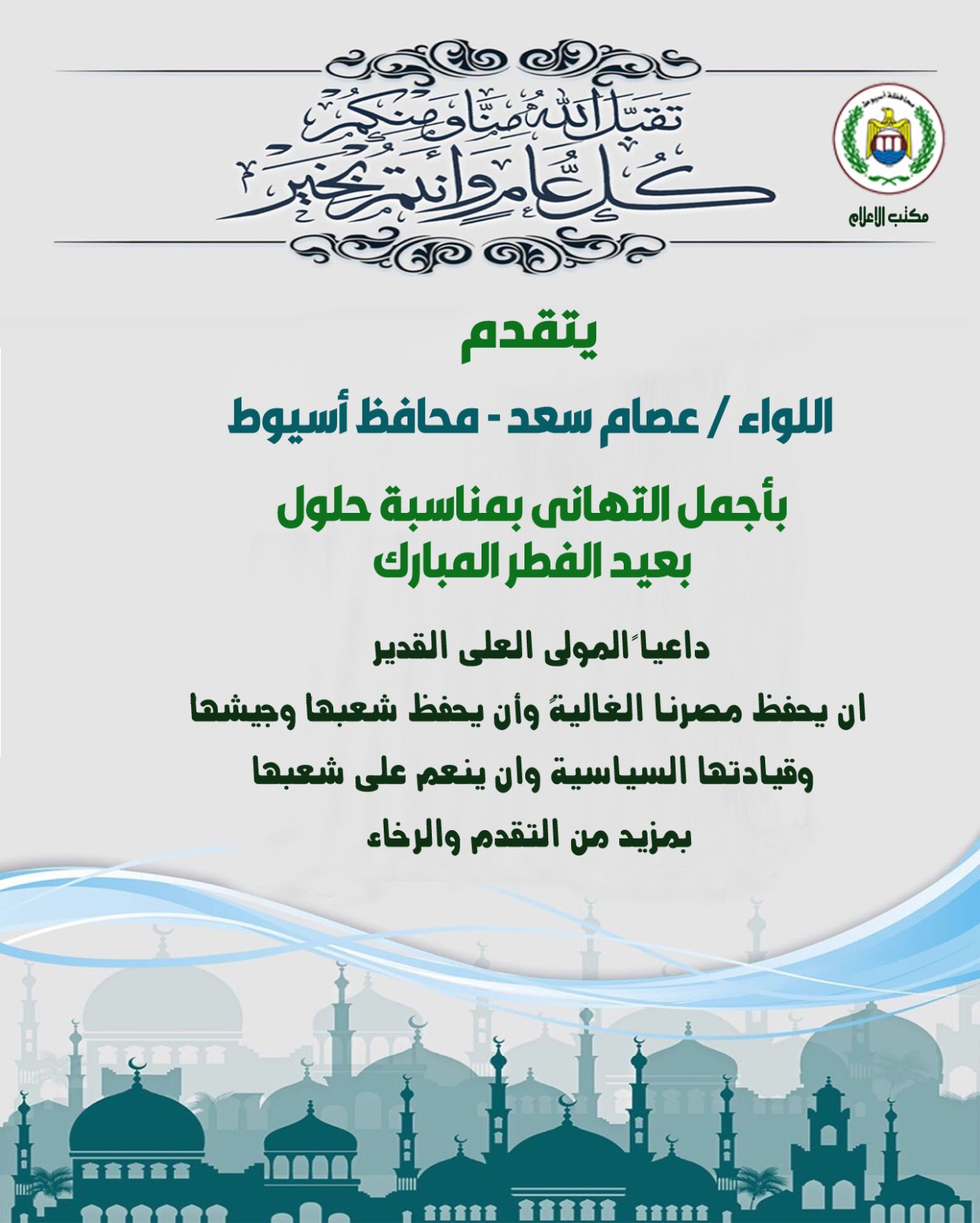 كما تقدم المحافظ بخالص التهنئة للشعب المصري عامة وأهالي محافظة أسيوط خاصة وأعضاء الجهاز التنفيذي وأعضاء مجلسي النواب والشيوخ عن جميع دوائر المحافظة بمناسبة قرب حلول عيد الفطر المبارك متمنيًا أن يحفظ الله مصر من كل مكروه وسوء وأن يعم الخير والنماء والرخاء على كافة ربوع مصر.