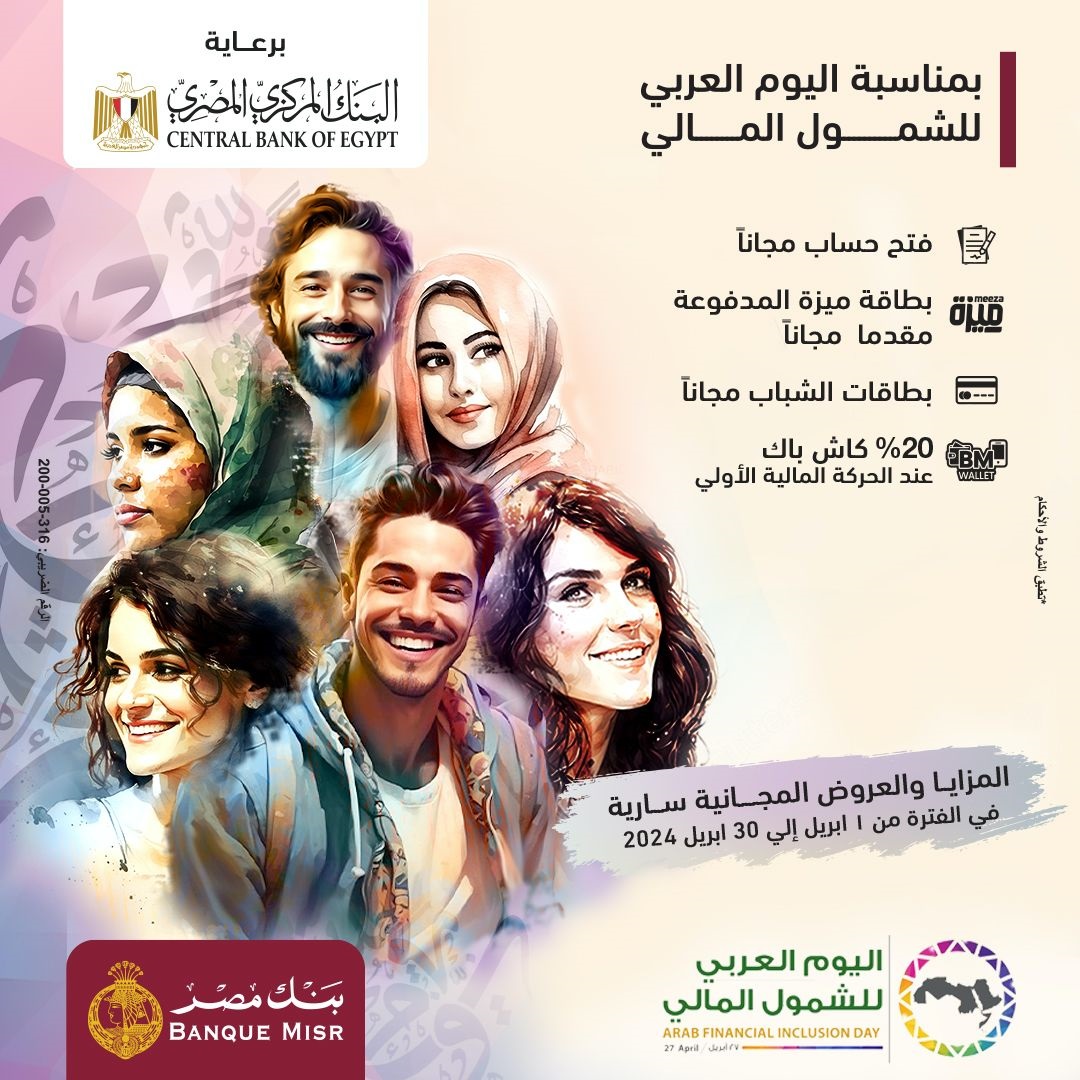 انطلاقاً من حرص بنك مصر على دعم جهود الدولة في تحقيق الشمول المالي، واتساقاً مع رؤية مصر 2030 لتحقيق التنمية المستدامة، قام البنك بتقديم العديد من المزايا والعروض المجانية بمناسبة "اليوم العربي للشمول المالي " تحت رعاية البنك المركزي المصري، ويأتي ذلك إيماناً منه بأهمية تحقيق الشمول المالي والذي يهدف إلى تمكين كافة شرائح المجتمع من الوصول إلى المنتجات والخدمات المالية التي تلبي احتياجاتهم المختلفة، ومنها على سبيل المثال حسابات التوفير، والحسابات الجارية، وخدمات الدفع والتحويل، والتأمين، والتمويل والائتمان، ويحرص البنك على توفير العديد من المزايا والعروض المجانية التي تخدم كافة العملاء وبخاصة المرأة والشباب، كونهم الفئة الأكبر في المجتمع، وذلك طوال مدة الفعاليات التي تمتد خلال الفترة من 1 الى 30 ابريل 2024.