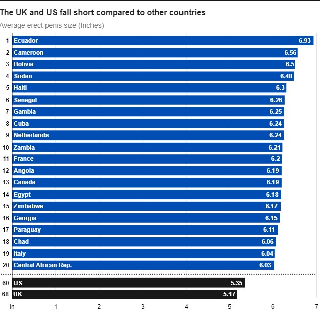 ووأضاف التقرير أن بريطانيا تأتي في المركز 68 بحجم قضيب يبلغ 5.2 بوصة (13.1 سم)، وتأتي أمريكا في المركز 60 بحجم 5.4 بوصة (13.5 سم)، وأن أستراليا تحتل المرتبة 43 بمتوسط حجم 5.7 بوصة (14.46 سم).