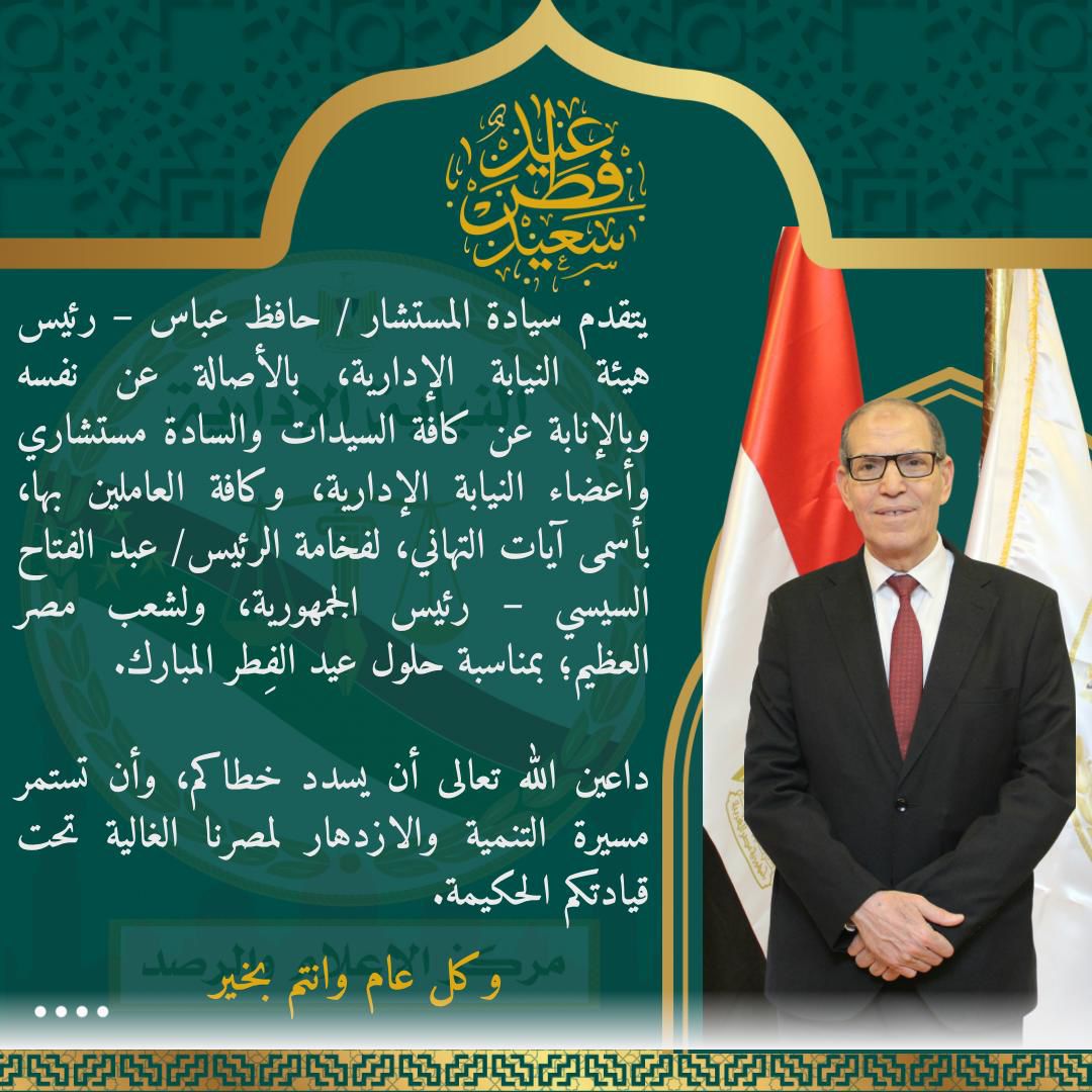تقدم المستشار حافظ عباس ، رئيس هيئة النيابة الإدارية، بالأصالة عن نفسه وبالإنابة عن كافة السيدات والسادة مستشاري وأعضاء النيابة الإدارية، وكافة العاملين بها، بأسمى آيات التهاني، للرئيس عبد الفتاح السيسي – رئيس الجمهورية، ولشعب مصر العظيم؛ بمناسبة حلول عيد الفِطر المبارك.