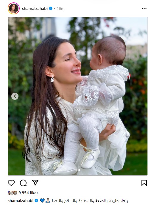 نشرت شام الذهبى ابنة المطربة أصالة نصرى ، صورة لها مع ابنتها جيهان وهى تهنئ متابعيها بعيد الفطر المبارك.