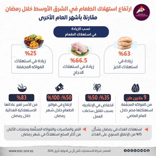 كشف مركز معلومات مجلس الوزراء إنه بالرغم أن شهر رمضان هو شهر الصيام، فإن استهلاك الطعام خلال الفترة من "الإفطار" إلى "السحور" يتجاوز نمط الاستهلاك الطبيعي. وترتفع فواتير الطعام بنسبة 50 إلى 100% خلاله.