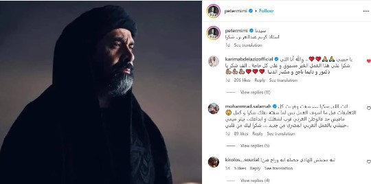 وجه النجم كريم عبد العزيز رسالة شكر للمخرج بيتر ميمي مخرج مسلسل الحشاشين، والذي نشر صورة كريم وكتب عليها عبر حسابه بموقع انستجرام، سيدنا استاذ كريم عبدالعزيز.. شكرا، ليرد كريم معلقا، "يا حبيبى والله أنا اللى شكرا على هذا العمل الغير مسبوق وعلى كل حاجة.. الف شكر يا دكتور ودايما ناجح ومكسر الدنيا".