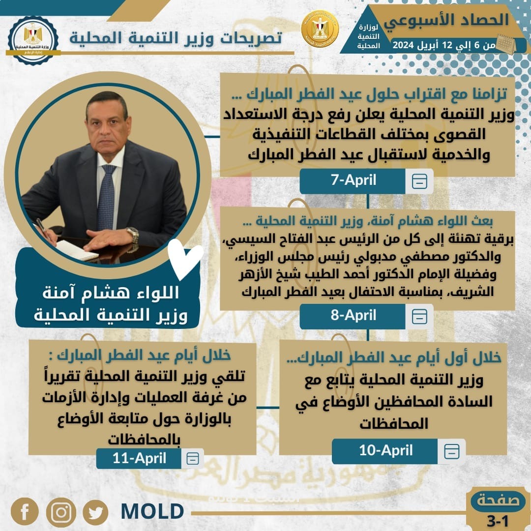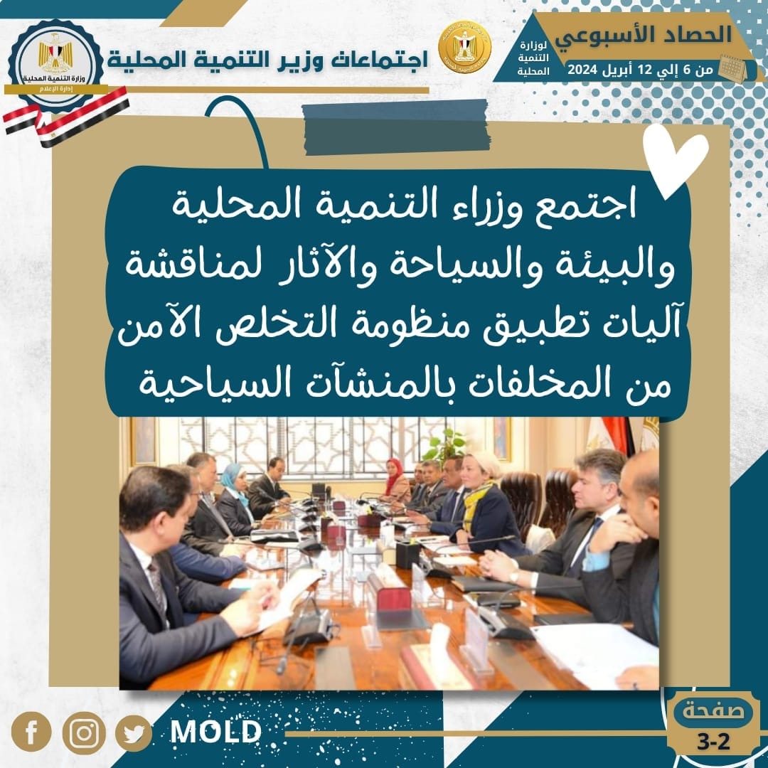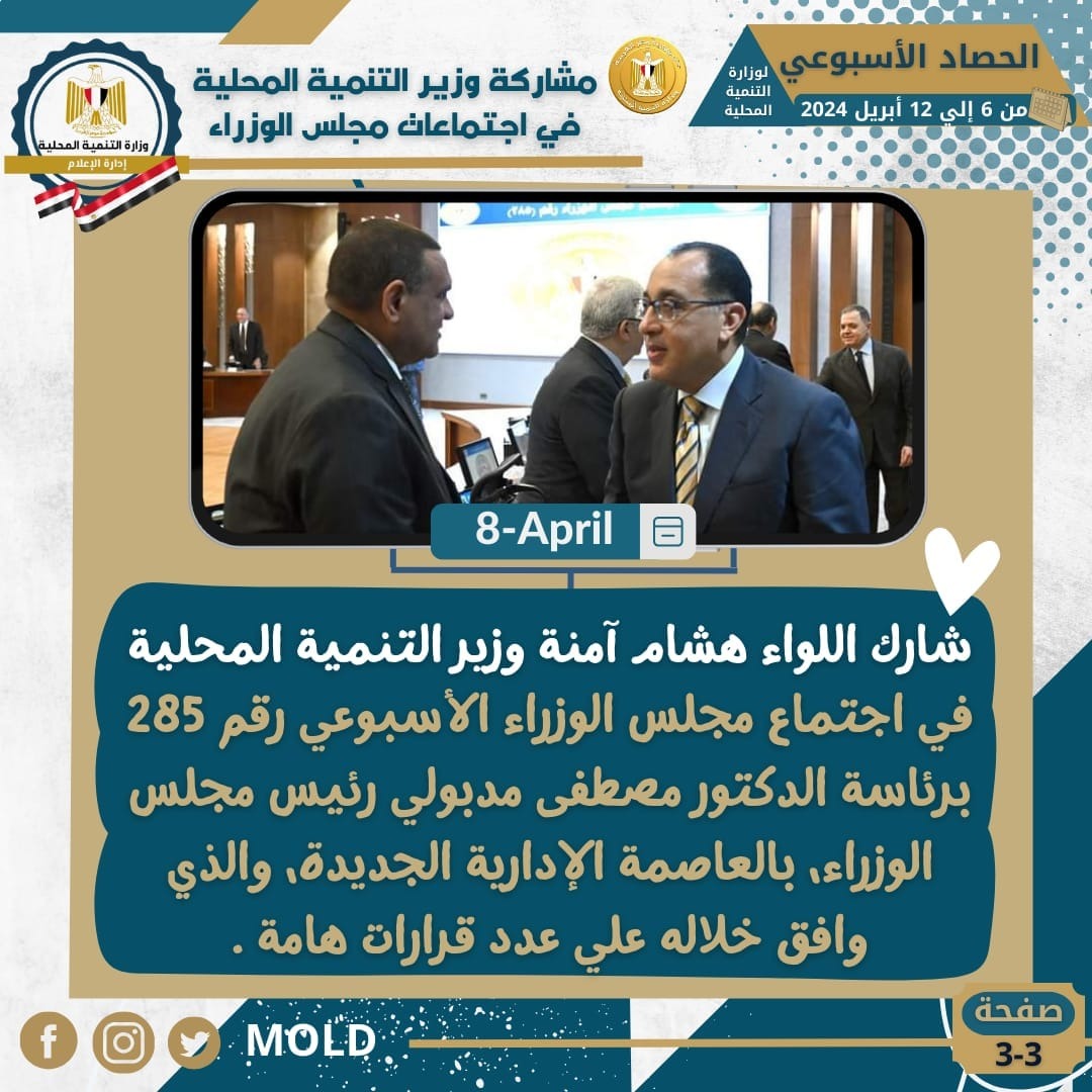 نشرة الحصاد الأسبوعي لرصد أنشطة وزارة التنمية المحلية في الفترة من 6 حتي 12 أبريل 2024