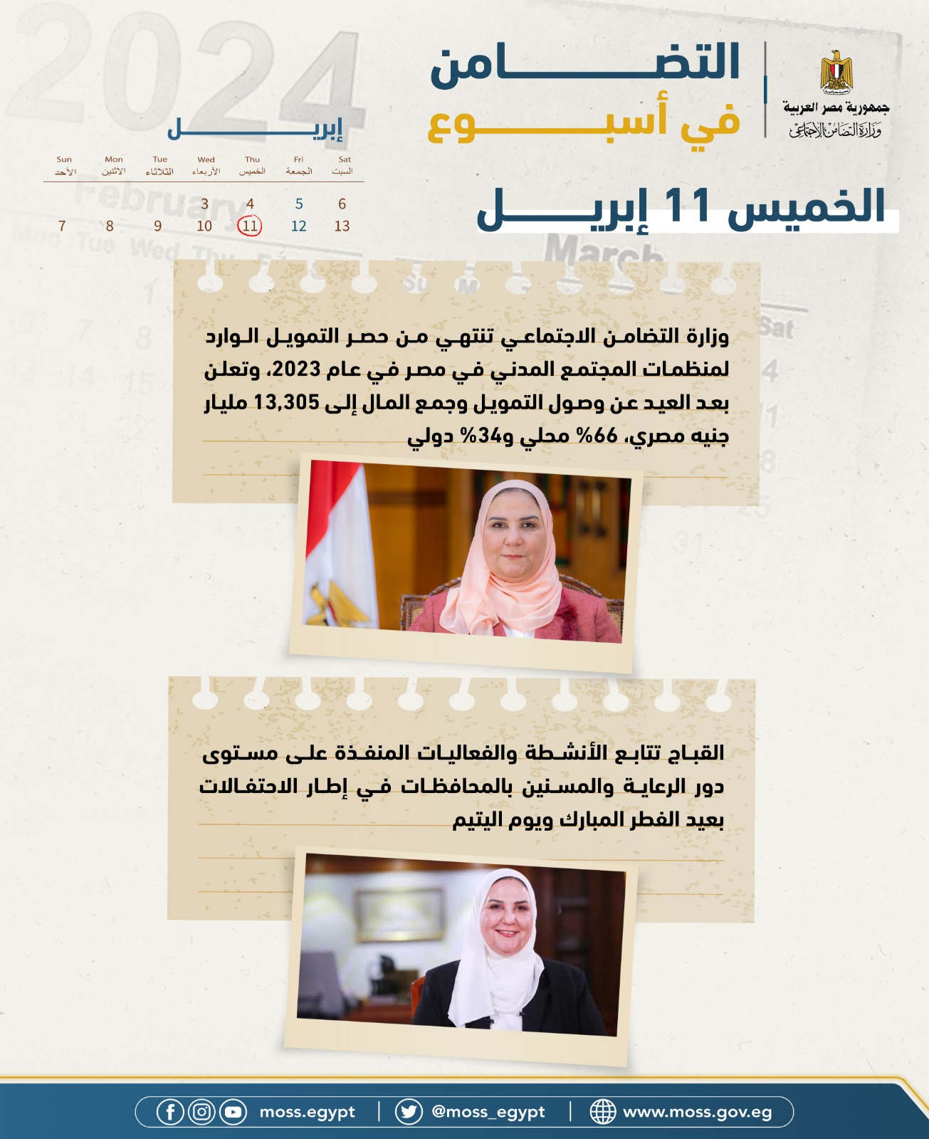 - وزارة التضامن الاجتماعي تنتهي من حصر التمويل الوارد لمنظمات المجتمع المدني في مصر في عام 2023، وتعلن بعد العيد عن وصول التمويل وجمع المال إلى 13,305 مليار جنيه مصري، 66% محلي و34% دولي.