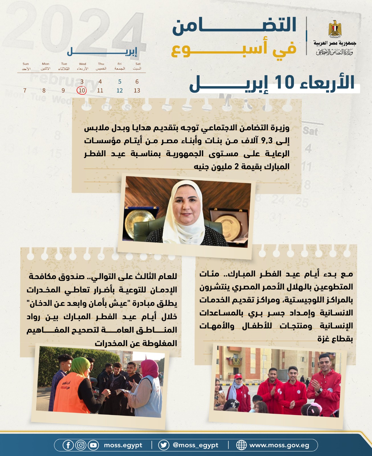 - وزيرة التضامن الاجتماعي توجه بتقديم هدايا وبدل ملابس إلى9,3 آلاف من بنات وأبناء مصر من أيتام مؤسسات الرعاية على مستوى الجمهورية بمناسبة عيد الفطر المبارك.