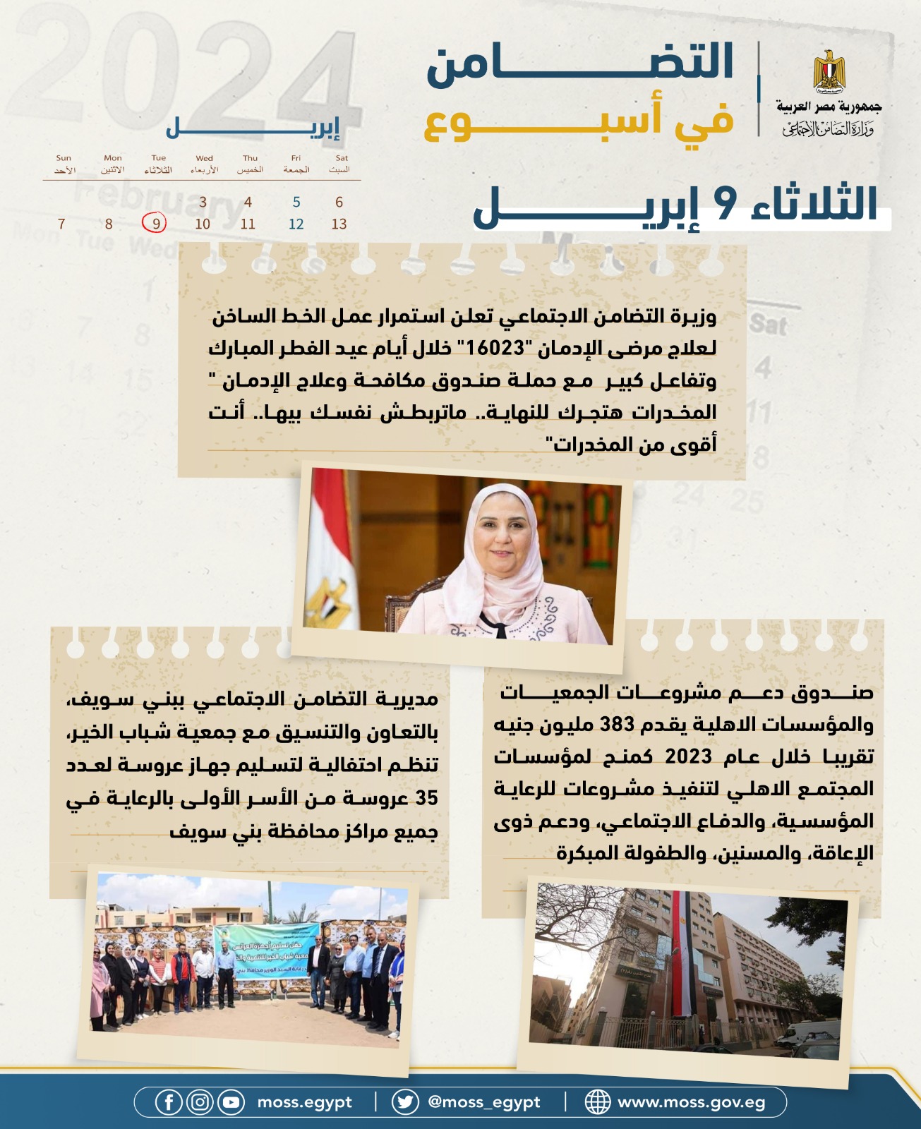 - وزيرة التضامن الاجتماعىُ تعلن استمرار عمل الخطالساخن لعلاج مرضى الإدمان "16023" خلال أيام عيدالفطر المبارك و تفاعل كبير مع حملة صندوق مكافحةوعلاج الإدمان " المخدرات هتجرك للنهاية.. ماتربطشنفسك بيها.. أنت أقوى من المخدرات.